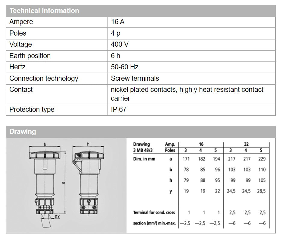 曼奈克斯连接器 3871;顶部电源,螺丝端子,16A-4P-415V,IP67