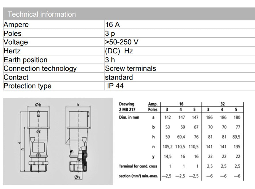 曼尼克斯插头 2184;螺丝端子,16A-3P-110VDC,IP44