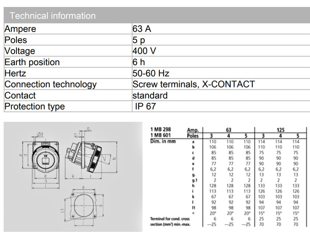 Mennekes 插座 209 插座;面板安装,63A-5P-415V,IP67
