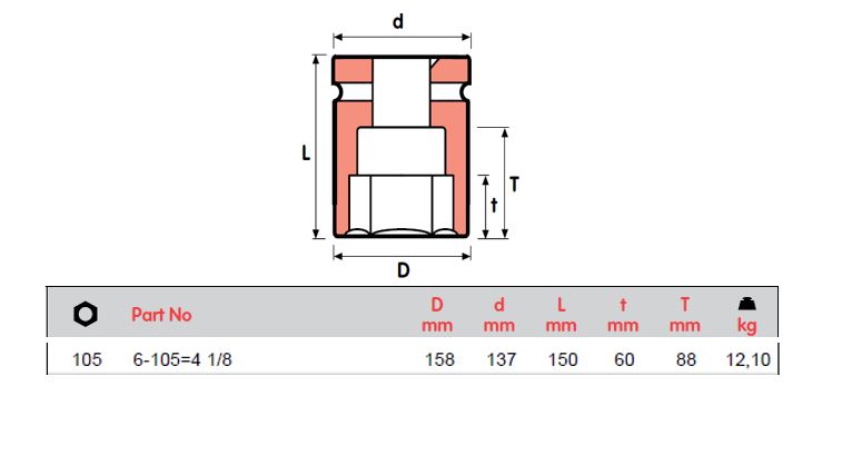 MOMENTO 冲击套筒,6-105=4 1/8, 6-110, 6-115, 6-120, 6-125, 6-130, 6-135, 6-145,内螺纹方形 2 1/2"